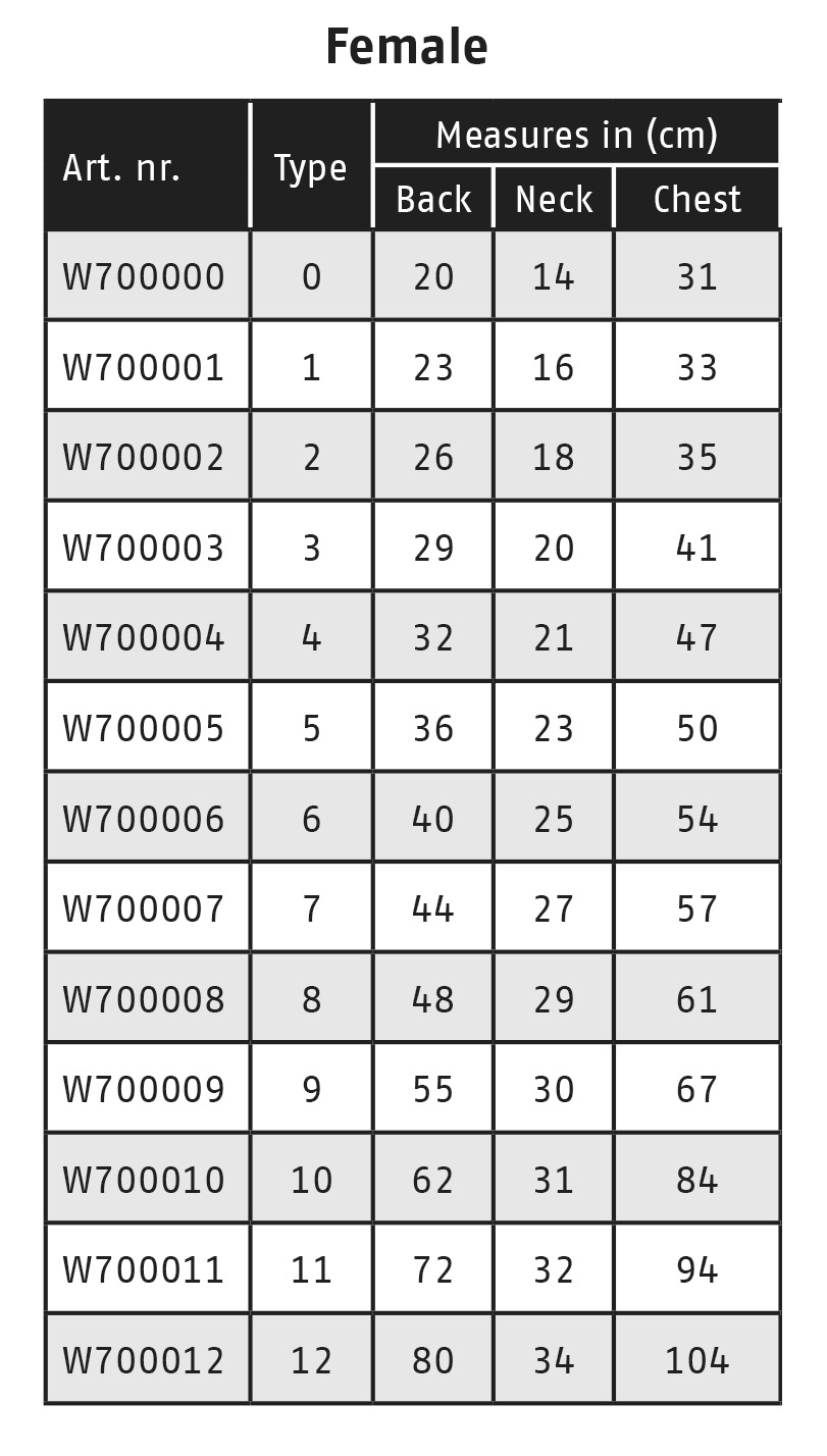 Hát: 23 cm, Nyak: 16 cm; Mell: 33 cm